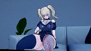 金发女同精灵在Hazbin Hotel场景中手指自慰。她们在Hentai动作中热情接吻。